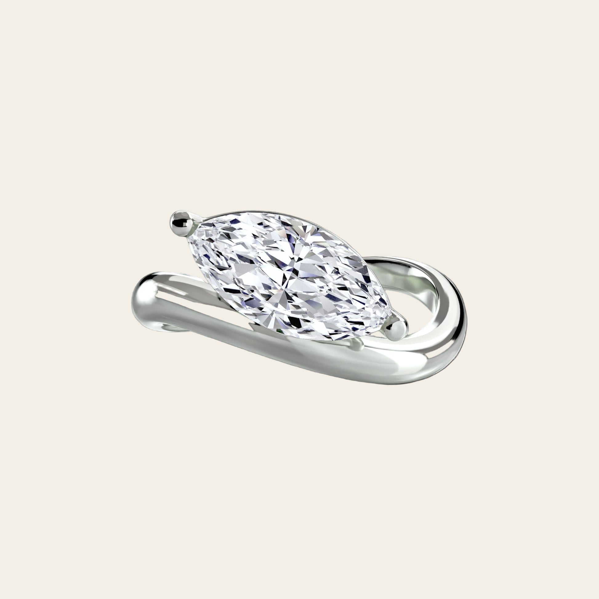 A love that doesn't bend, but flows naturally. The marquise-cut diamond extends elegantly, captured by a ring that seems to revolve around it in an eternal movement. Its clean, contemporary design makes this ring a symbol of purity and strength.